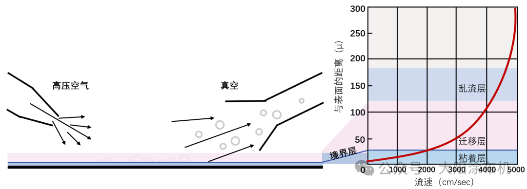 氣刀除塵法通過(guò)噴射高壓空氣剝離基材表面異物,并由真空系統(tǒng)同步回收去除的污染物。但其有效性受限于空氣阻力,氣流在距離薄膜表面數(shù)十微米處顯著衰減,導(dǎo)致邊界層內(nèi)微小異物的剝離力急劇下降(因風(fēng)力減弱無(wú)法將異物卷?yè)P(yáng)至紊流層),故難以清除此類(lèi)微粒。