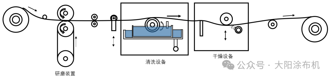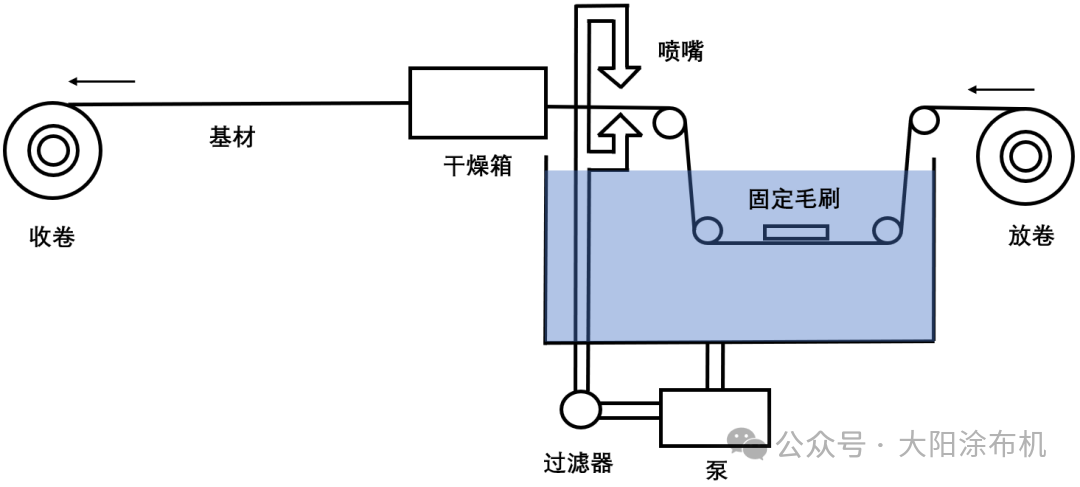 浸漬裝置在液體中與固定毛刷接觸,液體沖洗噴嘴和干燥箱沿薄膜行進(jìn)方向依次布置:浸漬→毛刷接觸清潔→液體沖洗→高溫干燥,如下圖。按基材行進(jìn)方向順序執(zhí)行。
