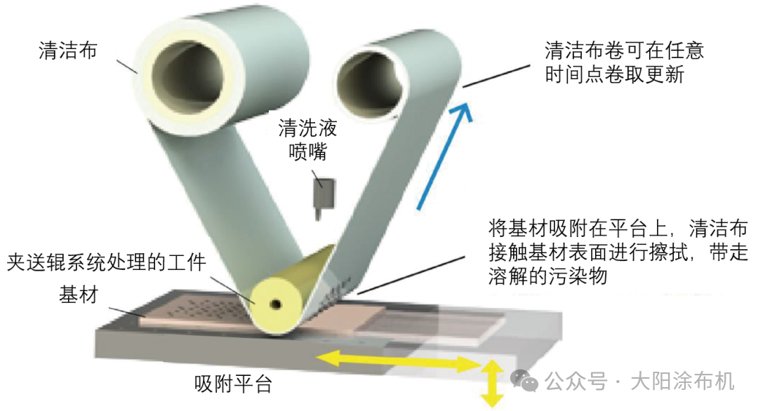 適用于去除殘留在基材表面的油類(lèi)、墨水、膠水、皮脂污漬等粘附性頑固異物。將溶劑或清洗液浸潤(rùn)在清潔布卷上,通過(guò)卷對(duì)卷方式輸送清潔布,同時(shí)用該布擦拭基材以去除污垢。擦拭下來(lái)的污垢隨著清潔布的卷取被隨時(shí)排出,從而防止二次污染。