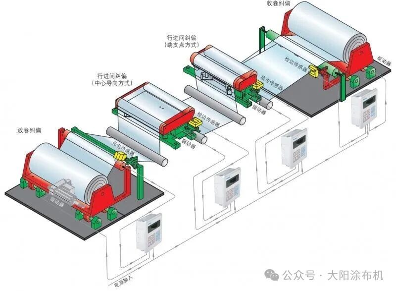 在涂布生產(chǎn)線上,基材經(jīng)歷放卷、涂布、干燥、復(fù)合、牽引和收卷等多道工序時,常因設(shè)備、材料或工藝參數(shù)等因素發(fā)生位置偏移。為確保涂布質(zhì)量與收卷整齊等工藝要求,必須對運行基材的松緊度和位置偏移進行實時糾正。其中,糾正基材橫向位置波動的系統(tǒng)稱為糾偏系統(tǒng);控制基材縱向張力穩(wěn)定的系統(tǒng)則為張力控制系統(tǒng)。兩者協(xié)同工作,共同保障生產(chǎn)過程的穩(wěn)定與產(chǎn)品的高質(zhì)量。