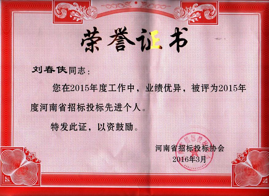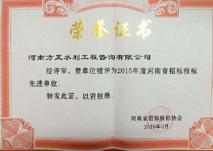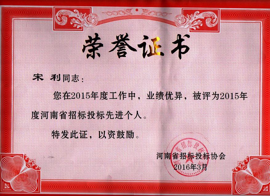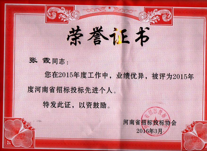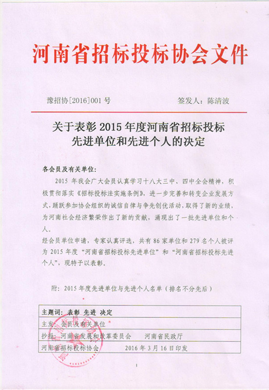 我公司被評(píng)為2015年度河南省招標(biāo)投標(biāo)先 進(jìn)單位和先 進(jìn)個(gè)人